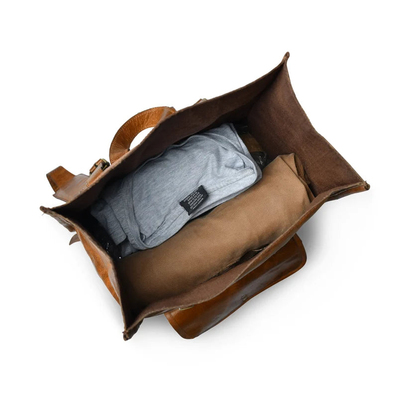 Our latest introduction to the iconic handmade rolltop backpack is one that stays true to our very original rolltop style. A minimalist, vintage road-ready travel backpack that forgoes the standard zipper for a roll top. The large roomy-lined compartment provides plenty of space to carry all your merchandise, travel, and work essentials including a 15-inch laptop. It is versatile in nature fill it up, roll it down as per your need.