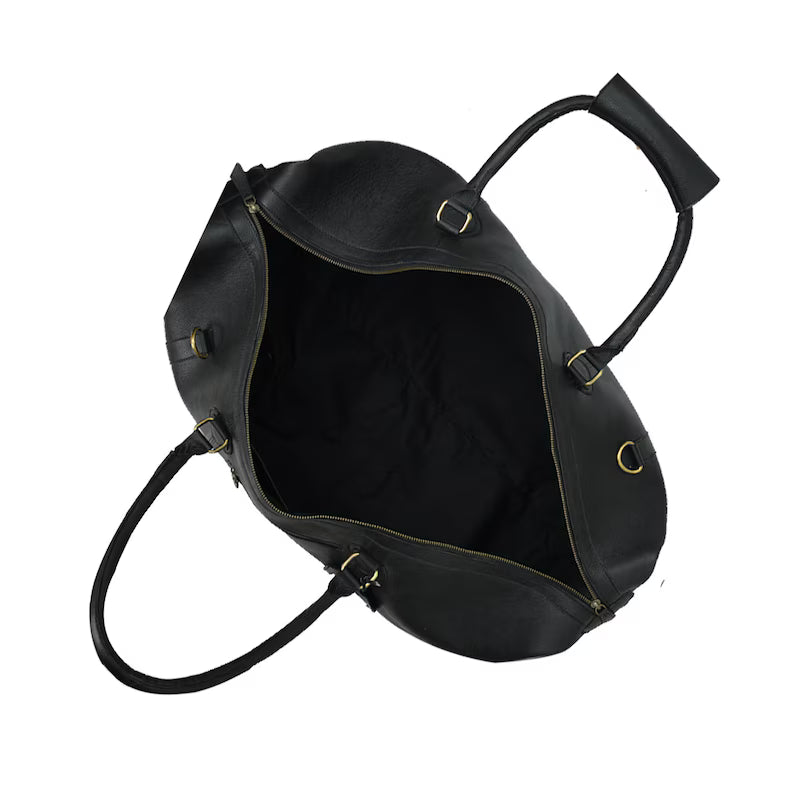 Our Morello hunter black leather weekender bag is handmade from soft full-grain leather. It features a cotton lined interior and antique brass hardware for a flawless finish. The ship hull-shaped designed mens leather travel bag is refined and practical with the capacity to pack for 3 days. The easy to access external and internal zipped pockets offer plenty of space to organize your travel essentials such as mobile phone, tickets, keys etc. Five brass studs on the base to protect it from scratches and scuff marks